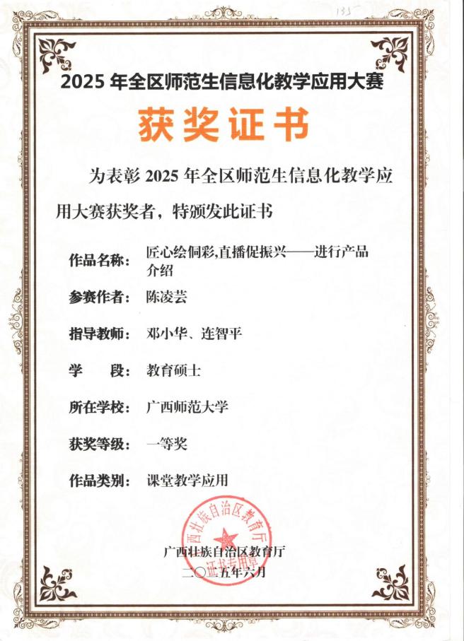 在本次大赛中,由邓小华、连智平老师指导的教育硕士研究生陈凌芸,其作品《匠心绘伽彩,直播促振兴——进行产品介绍》荣获课堂教学应用类一等奖。该作品紧密结合乡村振兴背景,融合直播技术与教学实践,体现了职教专硕在信息化教学设计与社会服务能力方面的深度融合。