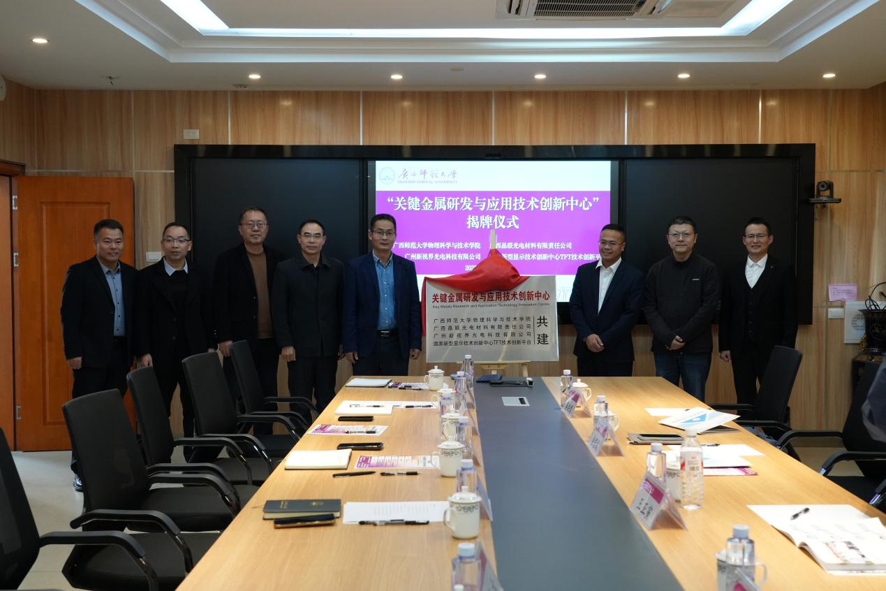11月21日下午,“关键金属研发与应用技术创新中心”揭牌仪式在广西师范大学物理科学与技术学院105会议室举行,物理科学与技术学院主要负责人、广西晶联光电材料有限责任公司总经理黄誓成和广州新视界光电科技有限公司副总经理王正寅共同揭牌。