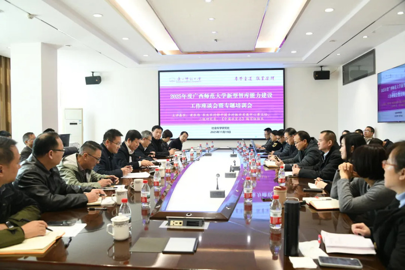 为学习宣传贯彻党的二十届四中全会精神,深刻领会、自觉贯彻《中共中央关于制定国民经济和社会发展第十五个五年规划的建议》以及习近平总书记就建设中国特色新型智库、建立健全决策咨询制度作出的一系列重要论述和指示精神,深入贯彻落实习近平关于广西工作论述的重要要求,进一步促进学术探索与服务国家战略需求、区域重大战略需求紧密融合,增强高校新型智库聚焦重大问题、重大需求开展协作攻关合作、承担重大项目和参与重大任务的能力,我校于11月19日在育才校区举办2025年度新型智库能力建设工作座谈会暨专题培训会,特邀农业农村部中国乡村振兴发展中心原主任、二级研究员,《中国扶贫志》编写组组长黄承伟作专题报告。校党委常委、副校长宋树祥出席会议并讲话,我校广西高校人文社会科学重点研究基地以及入选中国智库索引(CTTI)2024年度来源智库、中国智库综合评价研究项目(AMI)2025年智库入库单位等智库机构负责人及研究骨干,我校智库专家团队负责人及研究骨干、我校智库成果培育项目负责人及成员代表等近60人参加会议。会议由社会科学研究处负责人主持。