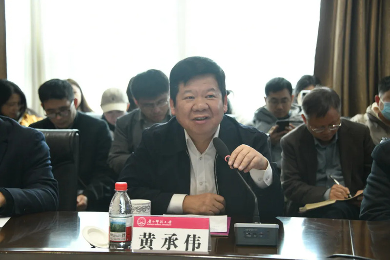 宋树祥代表学校对黄承伟研究员的莅临指导表示热烈欢迎与衷心感谢。结合我校智库建设的实践历程与发展愿景,他指出以有组织科研推动高校新型智库高质量发展作为推动学校科研高质量发展的战略支点,是服务国家战略与区域发展的重要支撑,是推动学科融合与学术创新的关键路径;长期以来我校高度重视高校新型智库建设,通过不断完善新型智库的体制机制建设,全面深化政产学研用协同创新,不断强化新型智库的战略研究能力、资源整合能力、调查研究能力、成果转化能力、对外交流能力建设;积极探索矩阵式创新范式,加强高校新型智库与政府智库、社会智库、企业智库、媒体智库协同创新;以广西人文社会科学发展研究中心为依托,打造广西高校智库服务平台和高校智库联盟;以广西高校人文社会科学重点研究基地建设为抓手,打造一批特色鲜明的智库;推进“问题+团队”的智库建设运作模式,开展关键问题订单式协同攻关,打造桂台合作与两岸融合研究团队等17个智库专家服务团队;探索建设共生教育智慧实验室等哲学社会科学实验室,以创建高能级科研创新平台和新型智库集群优势带动学校哲学社会科学的高质量发展。他强调,我校将推动优化学校新型智库建设体系,建强高水平的智库队伍和咨政研究团队,持续强化人文强桂品牌并加强广西人文社会科学发展研究中的协同及辐射带动作用,深化推进智库品牌声誉建设。