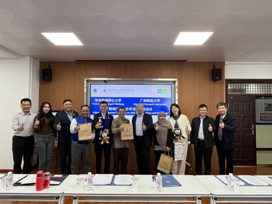 2025年11月20日下午,广西师范大学经济管理学院、研究生院、教育学部与印尼玛琅国立大学经济与商业学院、研究生院、心理学院在育才校区第二文科综合楼北楼715会议室举行合作推进会议。印尼玛琅国立大学经济与商业学院院长哈迪·苏马尔索诺博士、研究生院院长阿迪·阿莫科博士、心理学院院长图图·朱斯妮娅博士等一行来访,双方就多项合作议题进行了深入交流。