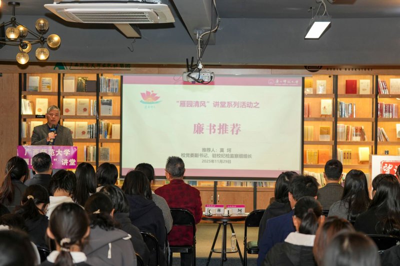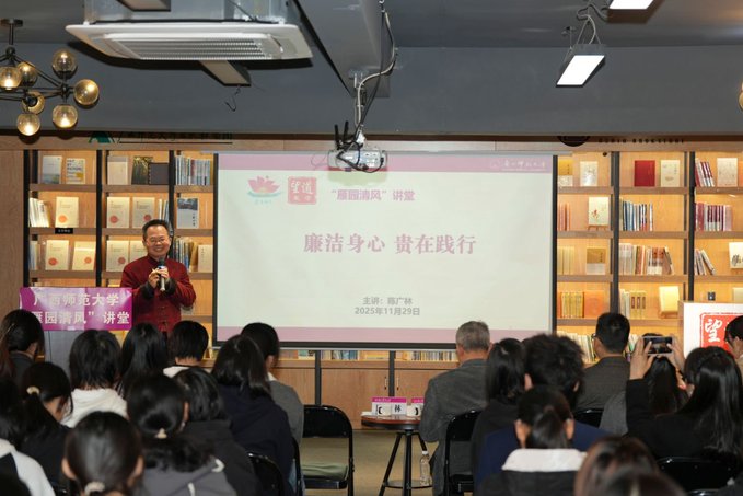 11月29日,党风廉政办联合出版社集团、校团委、研工部、学工部、经济管理学院在雁山校区独秀书房举办“雁园清风”讲堂系列活动。校党委副书记、驻校纪检监察组组长莫坷,文学院/新闻与传播学院教师陈广林等领导嘉宾,相关部门负责人与第四届校园廉洁大使、各学生社团代表70余人齐聚一堂,在系列活动中感悟廉洁真谛。