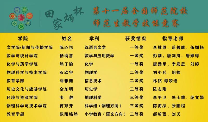 近日,第十一届“田家炳杯”全国师范院校师范生教学技能竞赛在浙江师范大学落幕。我校参赛选手凭借扎实的专业功底、精湛的教学技能和良好的综合素养,在此次高水平赛事中表现优异,共获得一等奖3项、二等奖2项、三等奖4项,充分展现了我校师范生培养的丰硕成果。