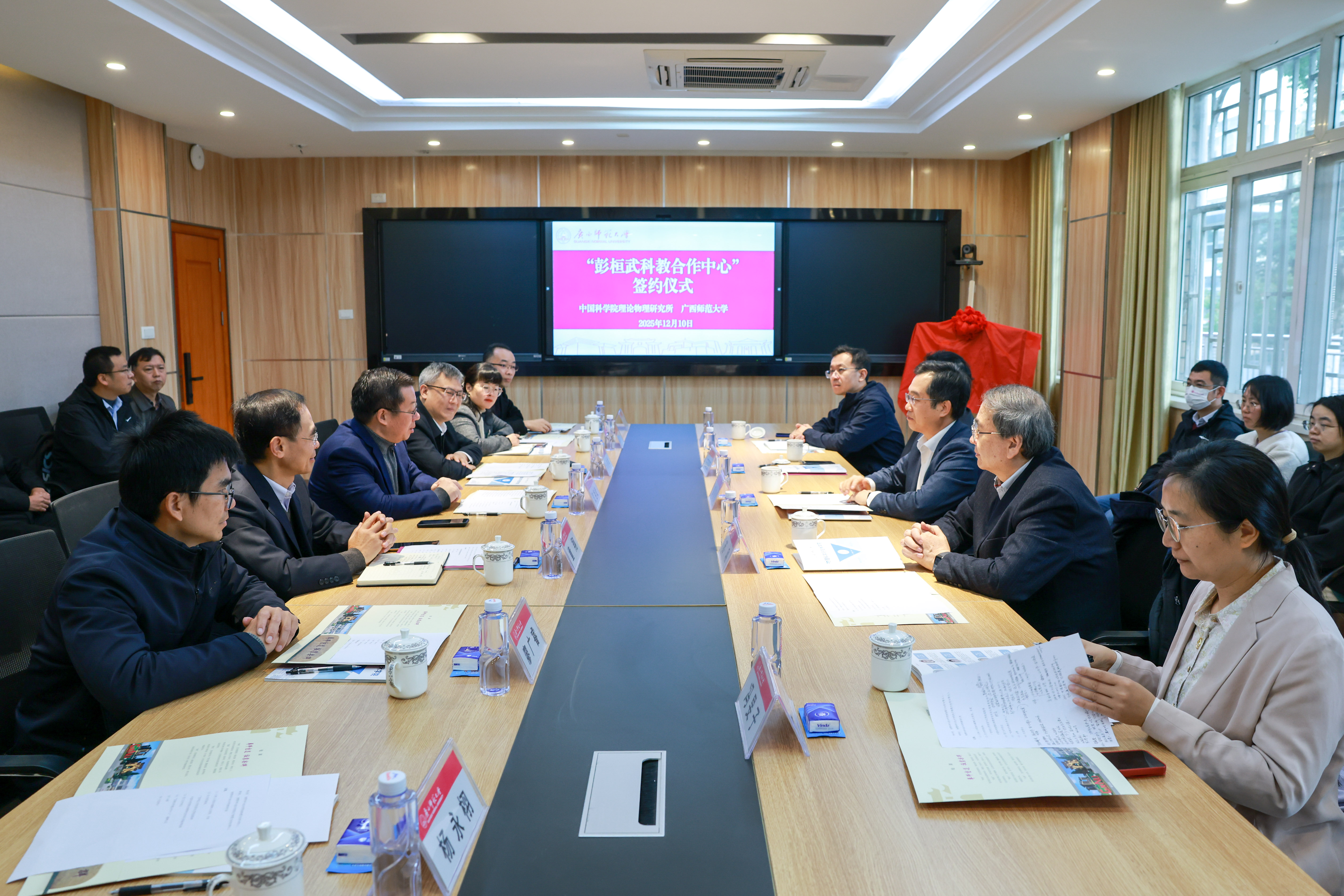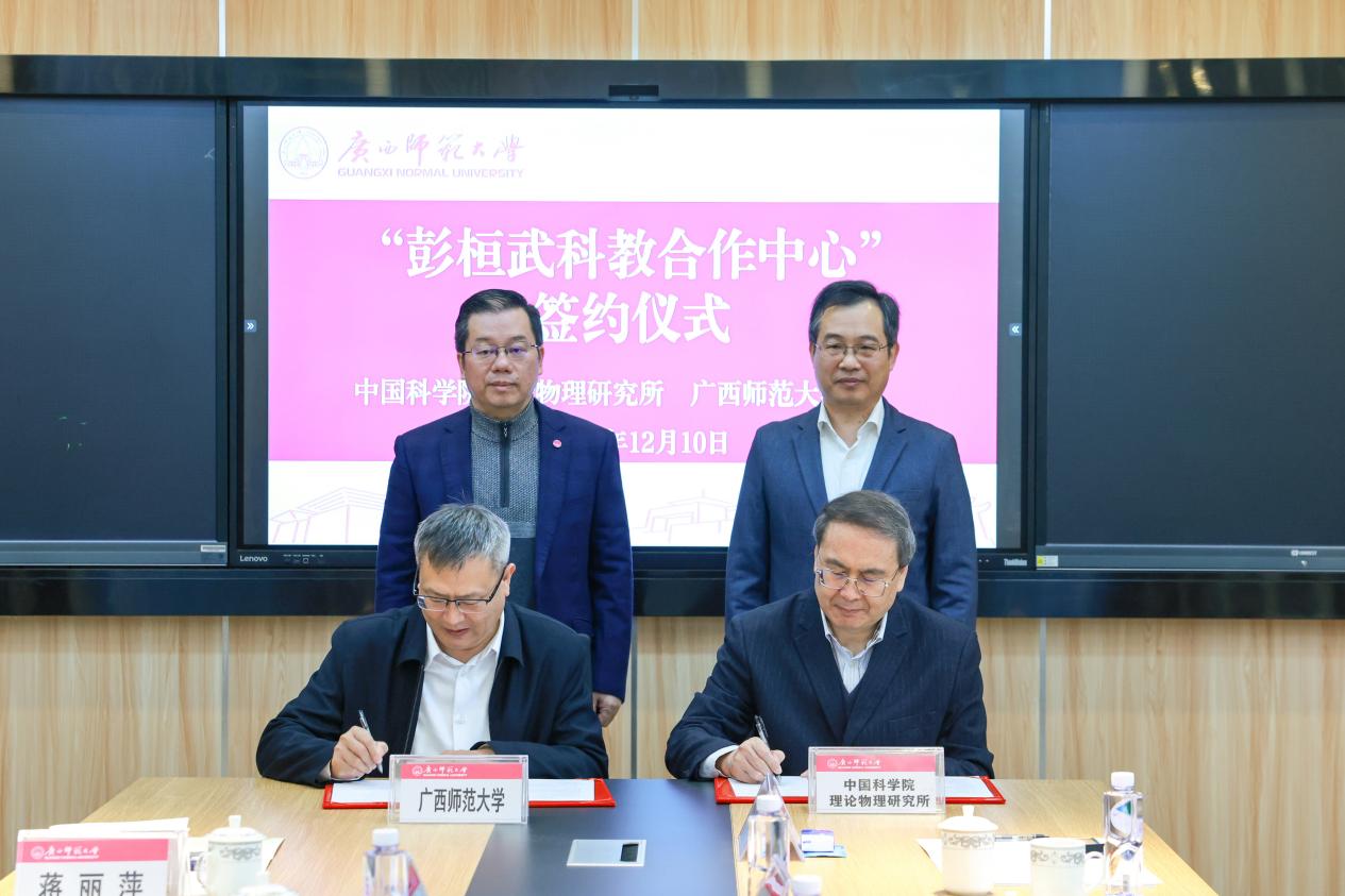 12月10日上午,“彭桓武科教合作中心”签约暨揭牌仪式在广西师范大学育才校区物理科学与技术学院105会议室举行。仪式由广西师范大学党委常委、副校长宋树祥主持。中国科学院理论物理研究所所长周善贵、副所长苏刚,广西师范大学党委书记贺祖斌,中国科学院理论物理研究所、校科技处、物理科学与技术学院等双方单位负责人、专家与教师代表共同出席。