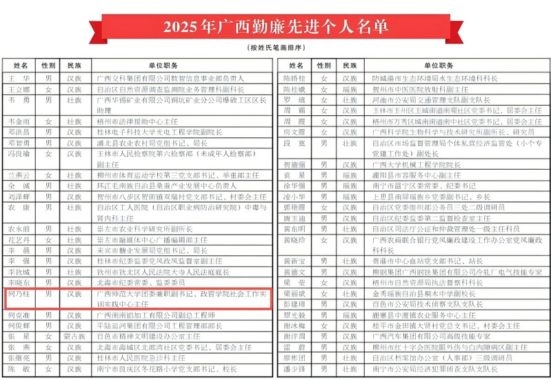 近日,由自治区纪委机关、自治区党委组织部、自治区党委宣传部联合组织的第五届广西勤廉先进个人评选结果揭晓,全区共50名优秀代表获此殊荣,广西师范大学团委兼职副书记、政管学院社会工作实训实践中心主任、社会学与社会工作系教工党支部党员教师何乃柱老师位列其中,成为全区党员干部和广大群众学习的勤廉榜样。