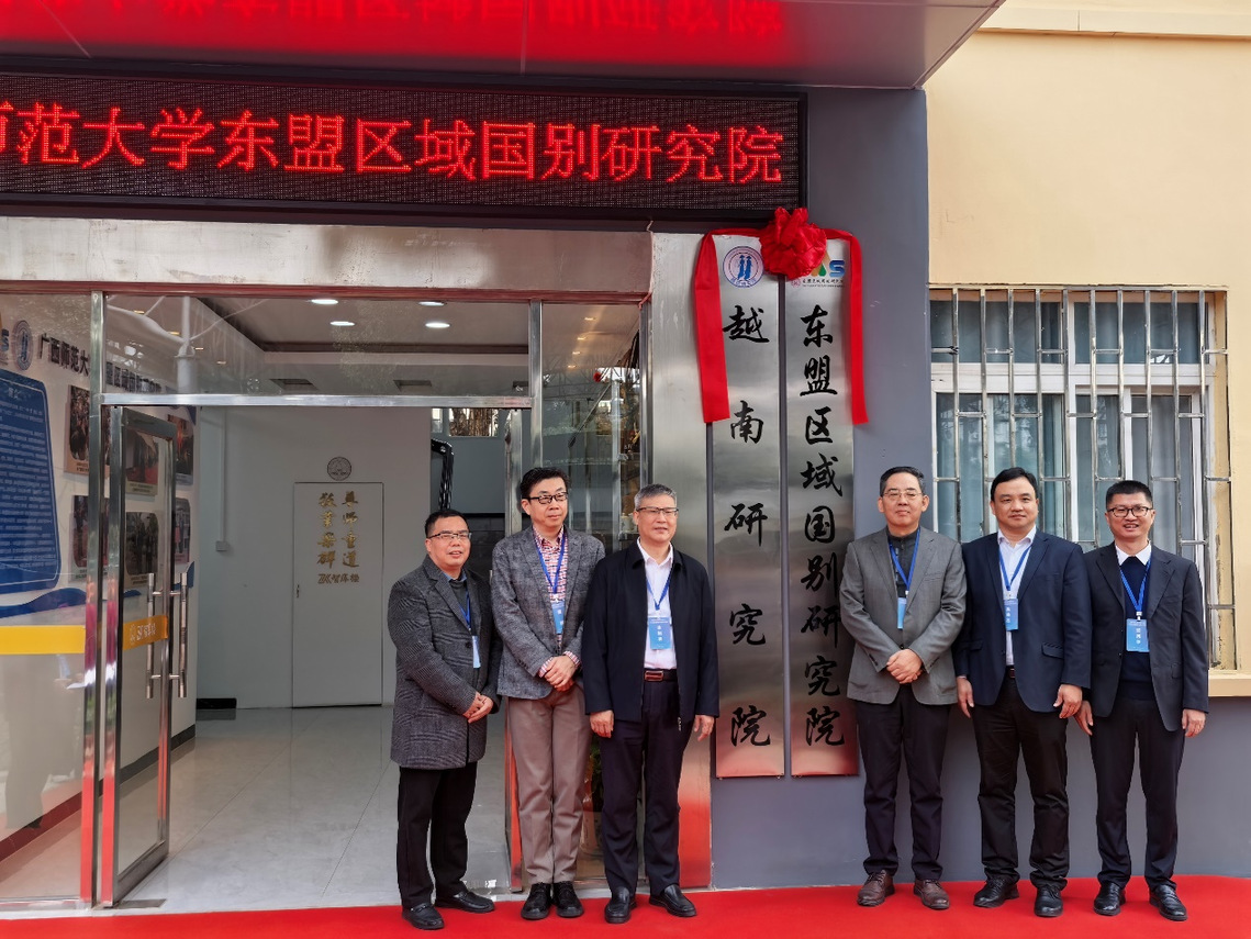开幕式结束后,举行了“广西师范大学东盟区域国别研究院”揭牌仪式。中国驻越南、驻新加坡原大使洪小勇先生,北京大学翟崑教授,厦门大学高艳杰教授,以及我校宋树祥副校长、经济管理学院张海丰教授、越南研究院陈国保教授共同为研究院揭牌。参加揭牌仪式的嘉宾还有中国驻越南大使馆原公使衔经济商务参赞胡锁锦先生、云南大学卢光盛教授、北京外国语大学刘铁娃教授、米良教授,中国社会科学院张洁研究员、暨南大学张云教授、外交学院任远喆教授等,以及我校部分师生代表。东盟区域国别研究院的成立,标志着我校在东盟区域国别研究领域的组织化、体系化建设迈出了关键一步。