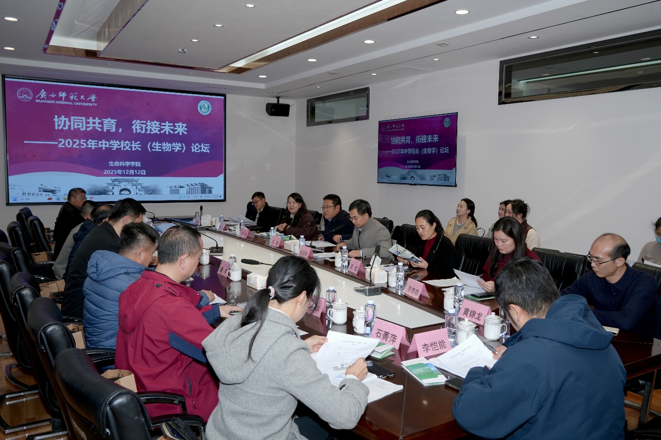 12月12日,生命科学学院在育才校区文科中心三楼会议室举办“协同共育,衔接未来——2025年中学校长(生物学)”论坛。本次论坛紧扣生物科学师范专业人才培养与就业衔接、学院“十五五”事业发展规划两大核心议题展开深入研讨。桂林市教育科学研究所教研员,桂林市第一中学、第八中学、第十八中学,桂林市中山中学、田家炳中学、桂林中学、桂林市卓然学校等多所中学的党委书记、校长、副校长等应邀出席论坛;生命科学学院领导班子、院长助理、学科教学论专业教师和毕业班辅导员代表等参加论坛。论坛由生命科学学院行政主要负责同志主持。