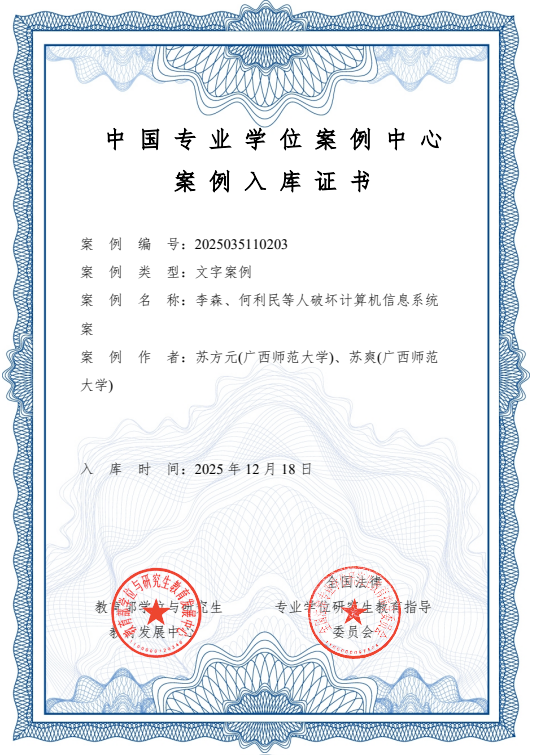 法学院行政主要负责人等撰写的《漓江流域生态破坏民事公益诉讼案》,段海风等撰写的《罗昌平侮辱“冰雕连”英烈案》,苏方元等撰写的《李森、何利民等人破坏计算机信息系统案》,张霞撰写的《张惠珍等与安徽华信国际控股股份有限公司等证券虚假陈述责任纠纷案》聚焦司法实践与社会热点,涵盖民商、刑事等多个法律领域。我校法学院将继续以案例教学为重要抓手,不断深化教育教学改革,创新实践育人模式,持续打造高质量法治人才培养高地,为服务法治中国建设与区域经济社会发展作出更大贡献。