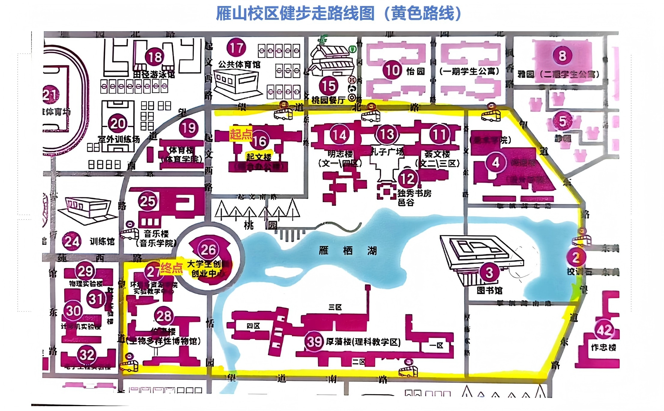 (二)雁山校区:起文楼北楼正门(集合点/起点)→美术学院→校训石→厚藩楼→生物多样性博物馆→环资学院→大学生创业中心二楼会议室(会议签到点/终点)。