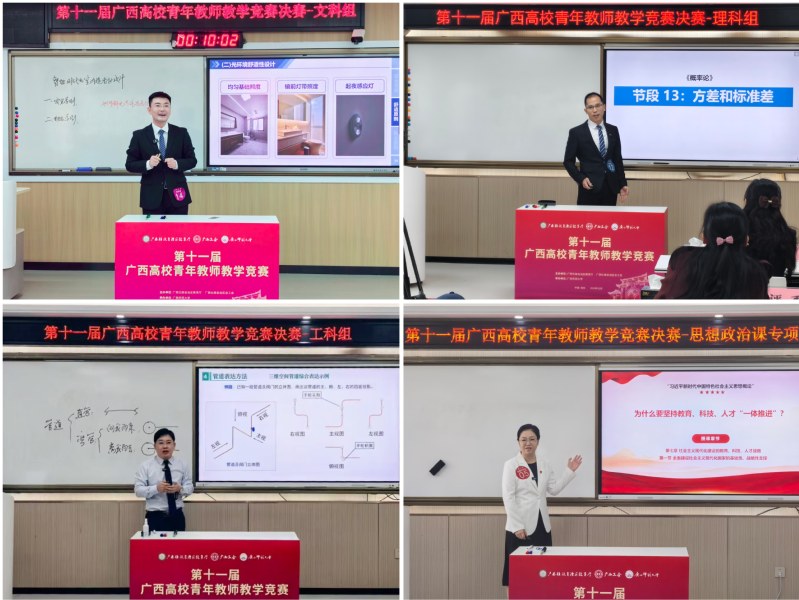 近日,第十一届全区高校青年教师教学竞赛决赛获奖名单正式公示,学校4名青年教师在全区76所高校、262名参赛选手的激烈比拼中脱颖而出,马克思主义学院莫梨老师斩获思政组一等奖第一名桂冠,设计学院郭靖老师、数学与统计学院赖廷煜老师、化学与药学学院蒋卷涛老师,分获文科、理科、工科三个组别一等奖。四项一等奖的成绩,既延续学校在广西青教赛赛事中的强势领跑态势,也彰显了学校青年教师队伍的过硬教学实力与育人担当。
