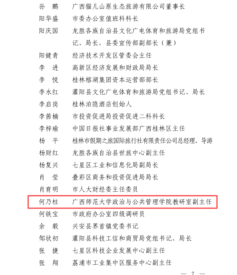 政治与公共管理学院社会工作教研室副主任、社会学与社会工作系教师党员何乃柱老师长期致力于发挥社会工作专业优势,秉持服务地方发展的理念,扎根教学科研一线,在政策制定、理论研究、产教融合、社会服务、公益事业以及环境保护等方面为桂林打造世界级旅游城市贡献了重要的智慧和力量,荣获“桂林市打造世界级旅游城市先进个人”称号。