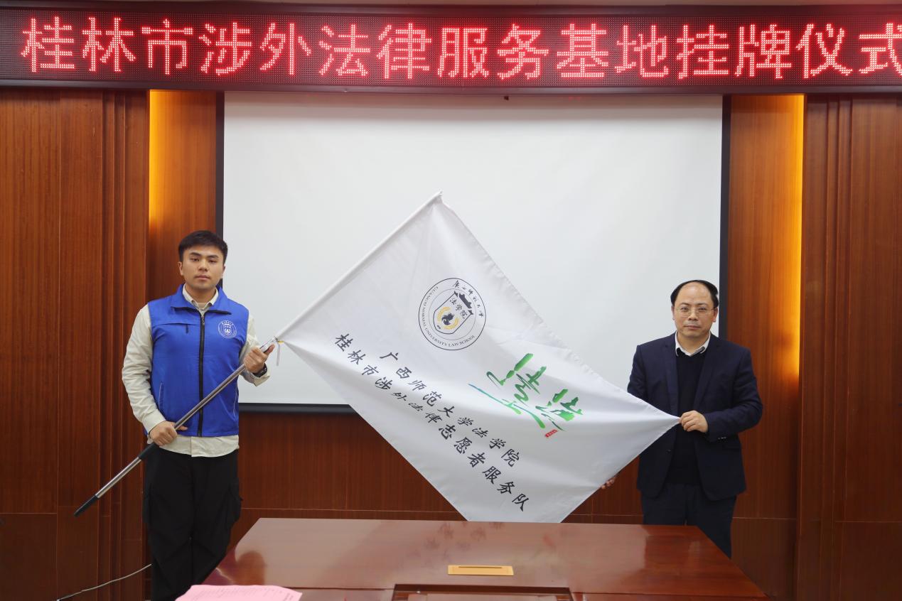 会上,法学院行政主要负责人与吕开运共同为桂林市涉外法律服务基地揭牌。分管本科生教学工作负责人为桂林市涉外法律服务志愿者服务队授旗。