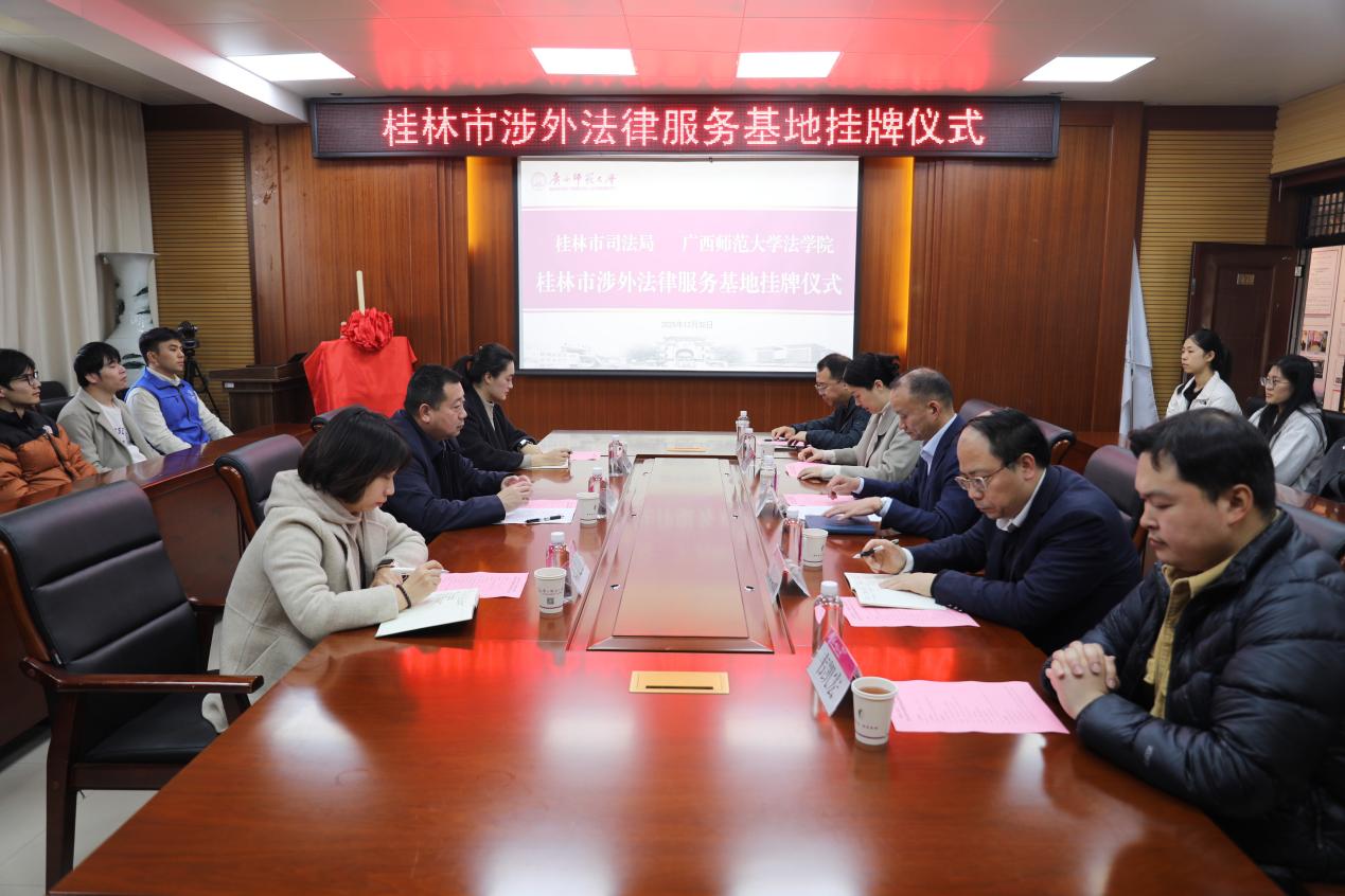 为深入贯彻习近平法治思想,全面贯彻落实党的二十届四中全会精神,充分发挥涉外法律服务对高水平开放和高质量发展的法治保障作用,12月30日,桂林市涉外法律服务基地挂牌仪式在广西师范大学法学院举行。桂林市司法局党组成员、副局长吕开运,广西师范大学法学院行政主要负责人、党委相关负责人、分管本科生教学工作负责人,桂林市委依法治市办秘书科相关负责人及法学院师生代表出席了本次挂牌仪式。