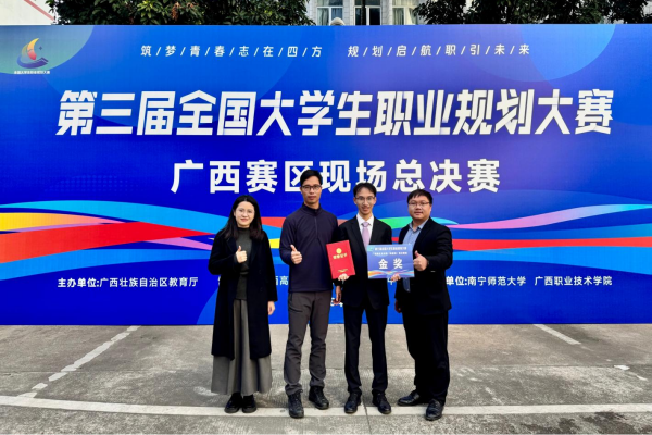 1月10日至11日,第三届全国大学生职业规划大赛广西赛区总决赛在南宁师范大学明秀校区举行。我院本科生刘一平(指导老师:卢俞成、冯回)凭借扎实的专业积淀、清晰的职业规划与出色的现场表现,最终斩获高教组就业赛道金奖。