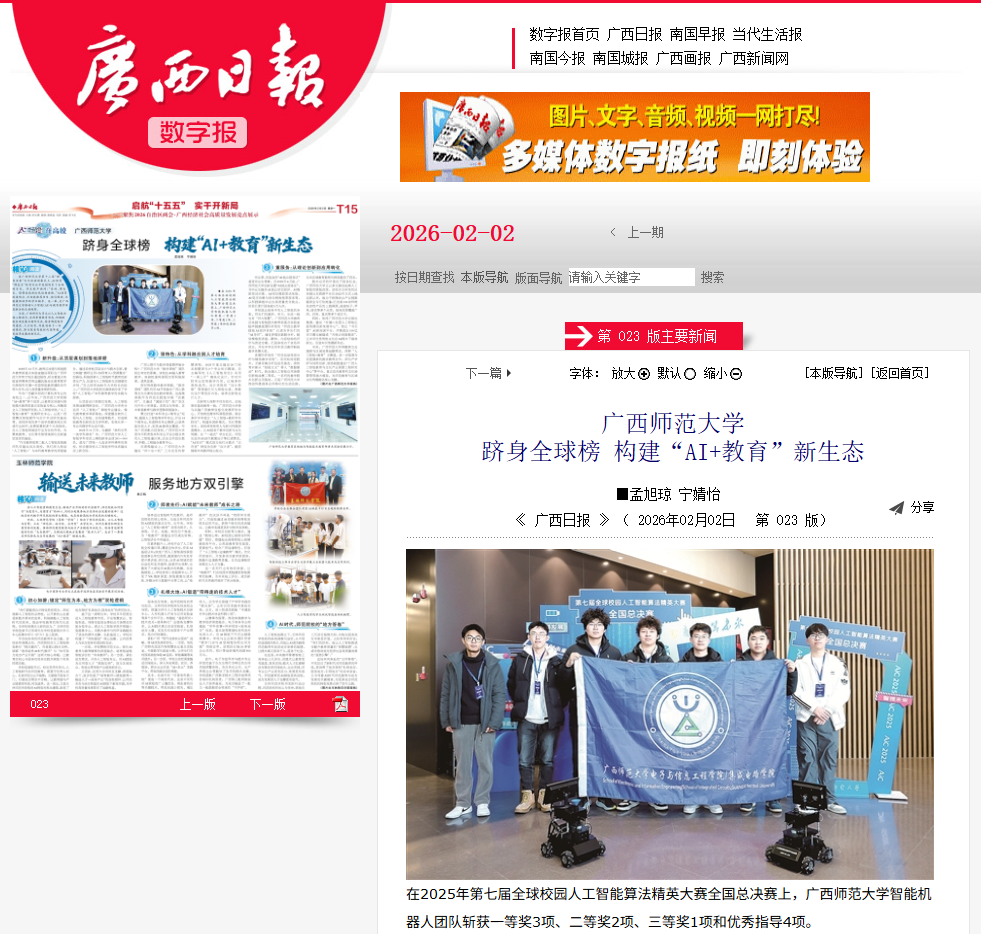 2月2日,《广西日报》023版以《广西师范大学跻身全球榜 构建“AI+教育”新生态》为题,聚焦关注我校推动人工智能(AI)与教育教学深度融合的实践经验与成果收获。文章指出,当前,广西师范大学正以人工智能为核心驱动力,全面重塑教育形态,积极赋能区域发展与国际交流,探索构建集学科建设、人才培育、科技创新于一体的路径,努力探索智能时代高等教育改革发展的新范式。