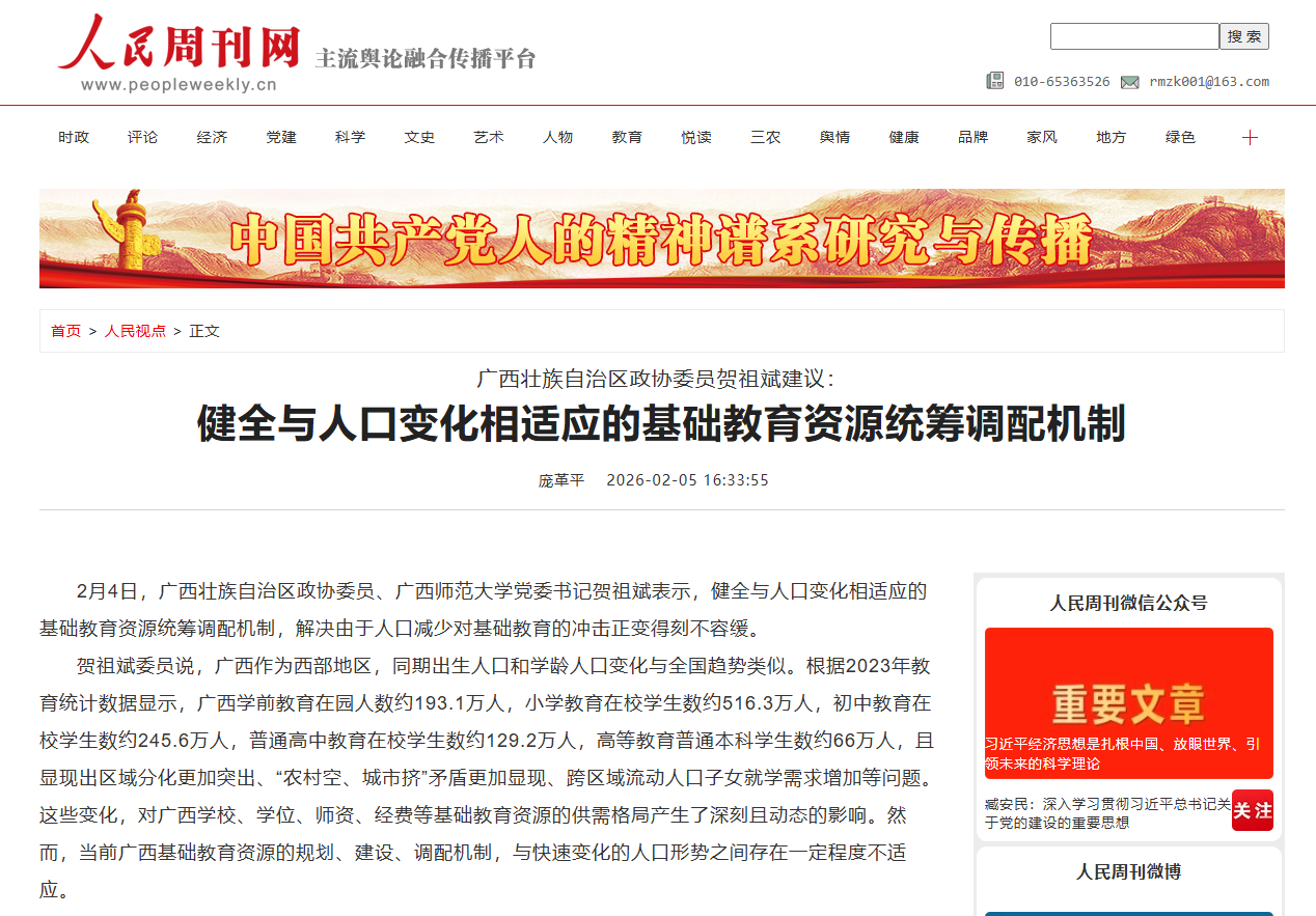 2月4日,广西壮族自治区政协委员、广西师范大学党委书记贺祖斌表示,健全与人口变化相适应的基础教育资源统筹调配机制,解决由于人口减少对基础教育的冲击正变得刻不容缓。