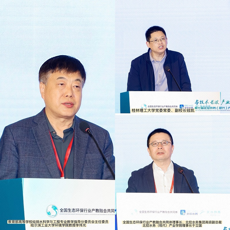 大会上,教育部高等学校给排水科学与工程专业教学指导分委员会主任委员、哈尔滨工业大学环境学院教授李伟光,全国生态环保行业产教融合共同体理事长、北控水务集团高级副总裁、北控水务(现代)产业学院理事长于立国,桂林理工大学党委常委、副校长钱凯也分别为大会致辞。李伟光教授强调产教融合需实现从“物理结合”到“化学融合”的质变,构建“人才共育、过程共管、成果共享”的育人共同体,通过打造“北控水务模式”,为专业教学改革树立样板。于立国副总裁指出,“十五五”开局之际,生态环保行业迎来绿色化、智能化转型机遇,北控水务产教融合探索成果契合教育部职业教育产教融合改革方向,并从“共育共享、数智赋能、协同创新”三大维度提出发展期待,以产教融合新成效赋能行业高质量发展,助力国家“双碳”目标实现。
