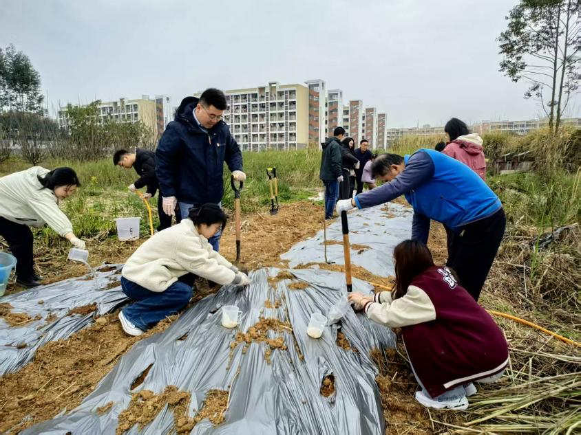 随后,全体党员满怀热情投入种植劳动。在生科院专业教师的现场指导下,大家分工协作、默契配合——挥锹挖坑、播种施肥、培土压实、围堰浇水,每一道工序都严谨规范、一丝不苟。劳动间隙,党员们围绕生态保护、支部建设、学科融合等话题展开交流,在挥洒汗水中增进情谊,在思想碰撞中凝聚共识。大家纷纷表示,支部共建活动既有意义又接地气,既在植绿护绿中强化了生态责任意识,又在共建联建中汇聚了支部合力,实现“植绿、护绿、育心”的有机统一。