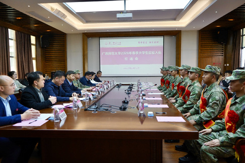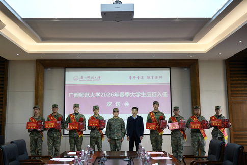 3月12日,我校在雁山校区第四会议室为2026年春季从学校光荣应征入伍的11名大学生举行入伍欢送会。校党委副书记黄文韬,秀峰区人民武装部副部长吴遵龙,宣传部、学工部、研工部、校团委、教务处、武装部相关负责同志,应征入伍大学生所在学院(部)分管学生工作的党委副书记,全体2026年春季应征入伍大学生及所在学院带班辅导员出席欢送会。会议由我校武装部主要负责人主持。