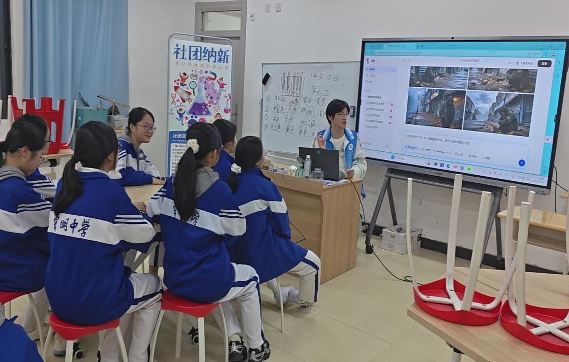 课堂上,团队成员从音色、调式等角度讲解声音科学知识,结合乐器演奏片段让同学们直观感受不同音色特点。在趣味实践环节,同学们根据音频写下感受关键词,并借助 AI 绘画工具将听觉体验转化为创意画作,在互动中深化对声音的理解。整堂课将科学知识与艺术创作结合,同学们积极参与、热情高涨,在轻松氛围中收获知识与乐趣。
