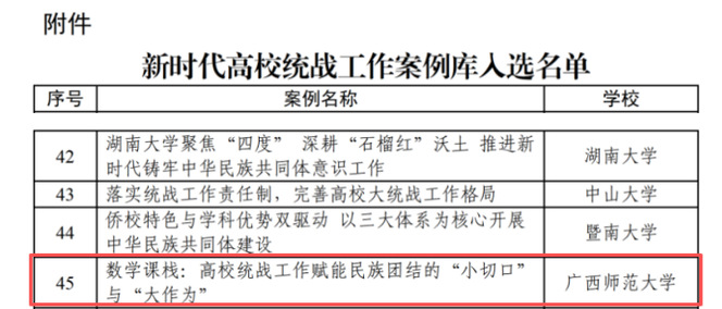 近日,由教育部思想政治工作司指导、中国高等教育学会统战工作研究分会组织评选的新时代高校统战工作案例库公布入选名单。学校党委统战部与数学与统计学院联合申报的《数学课栈:高校统战工作赋能民族团结的“小切口”与“大作为”》案例成功入选。