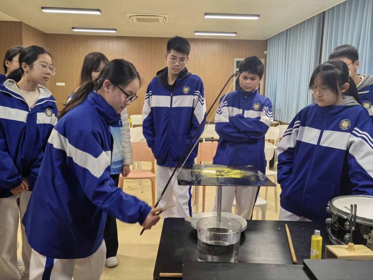 课堂上,主讲老师以生活场景为切入点,讲解分贝的定义与实际应用,结合图书馆、街道、演唱会等不同场景的分贝数值,让同学们直观理解声音强弱的衡量标准。在实践环节,学生分组使用手机分贝仪APP,实测教室安静状态、大声说话等不同场景的分贝值,在记录与对比中深化对声音强度的认知。活动中开展的克拉尼图形实验环节,主讲老师通过琴弦摩擦金属板引发振动,玻璃板上的细沙随振动频率变化,形成一幅幅对称精美的几何图案,让同学们亲眼见证“声音的形状”。大家专注观察、踊跃提问,沉浸式感受声学物理的奇妙魅力。