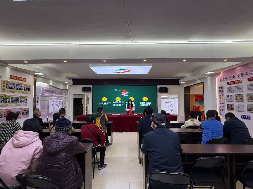 在社区活动中,团队针对老年群体对人工智能技术普遍存在的陌生感与畏难心理,探索出“情感沟通先行、技术普及跟进”的服务模式。在朝阳社区,队员们从老人日常出行、就医、社交等实际需求切入,用通俗易懂的语言帮助老人们初步认知人工智能的应用价值。在空明社区,队员们通过现场调研发现,社区老年群体的人工智能使用状况大多停留在接入阶段,亟需专业指导与帮助。针对当前人工智能诈骗频发的现状,队员们开展了防范AI诈骗专题宣讲活动,结合真实案例详细拆解AI换脸等新型诈骗手段,指导老人识别诈骗陷阱,切实提升防范意识和自我保护能力。在大圆盘社区,队员们指导老人操作豆包APP,体验语音查询天气、老照片修复等实用功能,老人们纷纷主动尝试,现场气氛热烈。在贵港市金港社区,队员们将抽象的AI知识具象化,现场演示主流AI工具的操作步骤,帮助居民快速掌握实用技巧。
