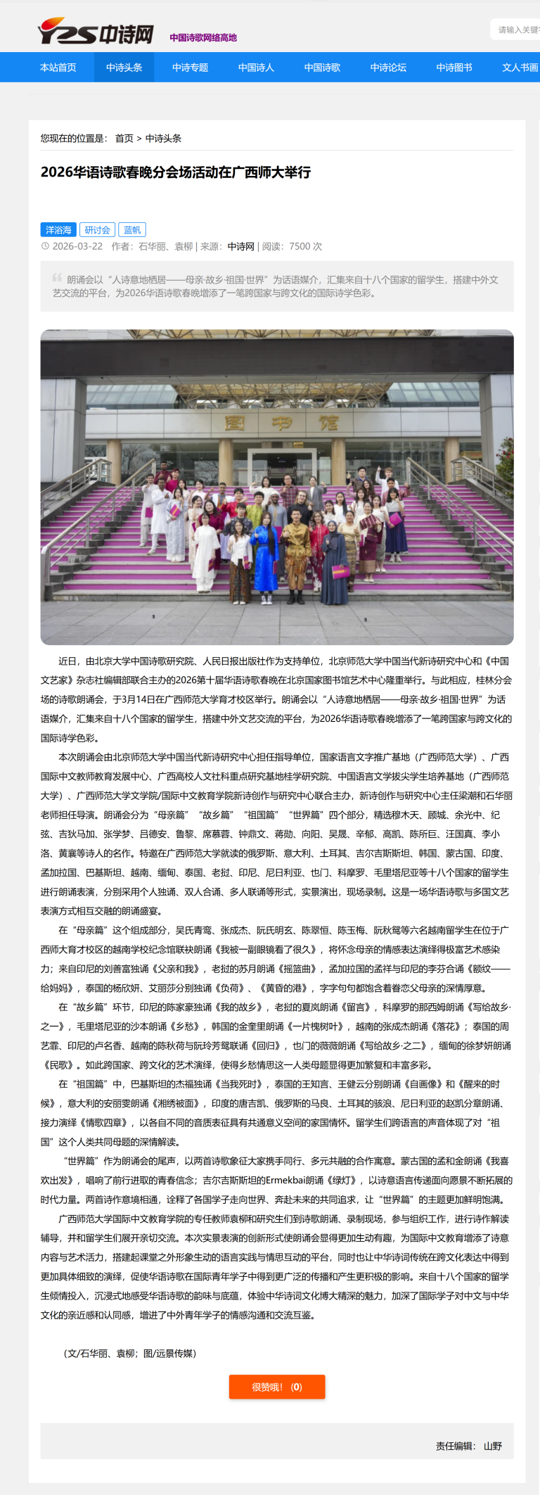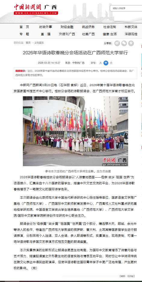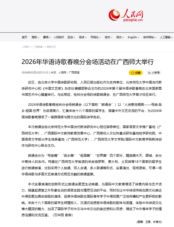 近日,由北京大学中国诗歌研究院、人民日报出版社作为支持单位,北京师范大学中国当代新诗研究中心和《中国文艺家》杂志社编辑部联合主办的2026第十届华语诗歌春晚在北京国家图书馆艺术中心隆重举行。与此相应,桂林分会场的诗歌朗诵会,于3月14日在广西师范大学育才校区举行。朗诵会以“人诗意地栖居——母亲·故乡·祖国·世界”为话语媒介,汇集来自十八个国家的留学生,搭建中外文艺交流的平台,为2026华语诗歌春晚增添了一笔跨国家与跨文化的国际诗学色彩。