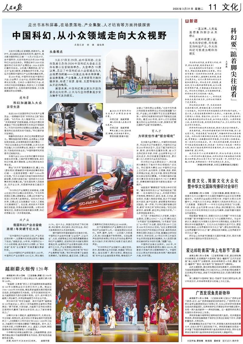 3月31日,【人民日报】关注报道由广西弄岗国家级自然保护区、广西师范大学、浙江省林业勘测规划设计有限公司、长白山科学研究院等单位组成的联合调查团队,在弄岗国家级自然保护区开展综合科学考察时,发现喀斯特洞穴鱼类新种——弄岗异条鳅。该成果已在国际分类学权威期刊正式发表,为我国西南喀斯特生物多样性研究再添重要新记录。
