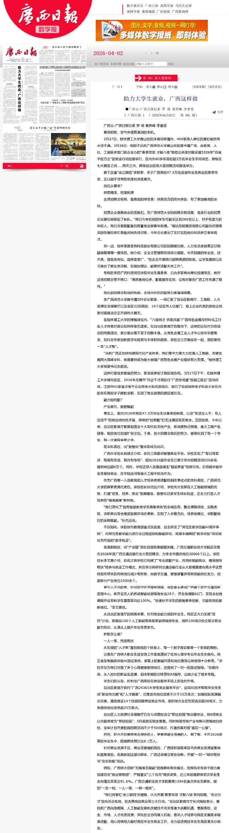 4月2日,《广西日报》在001版头版刊发《助力大学生就业,广西这样做》报道,聚焦广西在“金三银四”求职季针对47.5万名应届高校毕业生开展的就业春季攻坚行动,重点报道桂林两场自治区级大型招聘活动,并以广西师范大学为典型,展现我区高校在供需精准对接、数智化人才培养、困难群体兜底帮扶等方面的创新实践与显著成效。