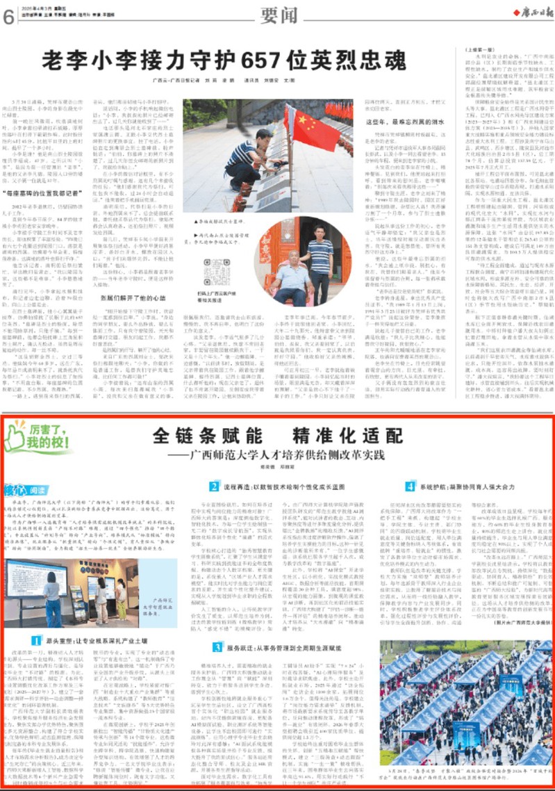 4月3日,《广西日报》第006版以《全链条赋能 精准化适配 —— 广西师范大学人才培养供给侧改革实践》为题,关注报道我校作为广西唯一入选教育部“人才培养供需适配机制改革试点”的本科院校,在人才培养供给侧改革领域的系统性创新举措、全链条闭环实践与标志性育人成效,向全区集中展现了我校坚守为党育人、为国育才初心,服务地方经济社会发展的师大方案与师大担当。